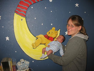 We had him dedicated at church this past Sunday. I thought it was really neat and I know the Lord will hold him in His hands as he goes through life. Ryan is almost as big as his Pooh now. I really can't believe how fast he's growing. I know I shouldn't be surprised, but I am. My sister is going to watch him for a while on Saturday so Eric and I can go out to eat or something. I asked her if she wanted to watch him for an hr or so and she said, "I would love to for more than an hour, for more than three!" lol. She's goofy. I really don't know if I'll be able to go though, I haven't been away from him for more than 30 minutes since he was born.
